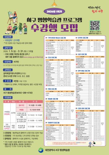 [뉴스다컴] 대전 서구는 12월 5일부터 24일까지 2026년 1학기 평생학습관 프로그램 수강생을 모집한다.