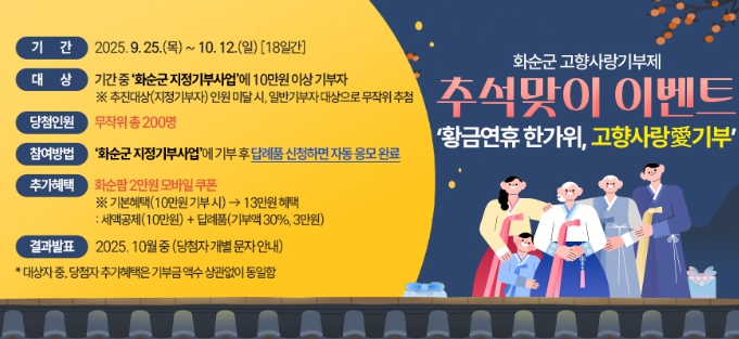 [뉴스다컴] 화순군은 민족 대명절 추석을 맞아 고향사랑기부제 감사 이벤트인 ‘황금연휴 한가위, 고향사랑愛기부’를 오는 9월 25일부터 10월 12일까지(18일간) 진행한다고 밝혔다.