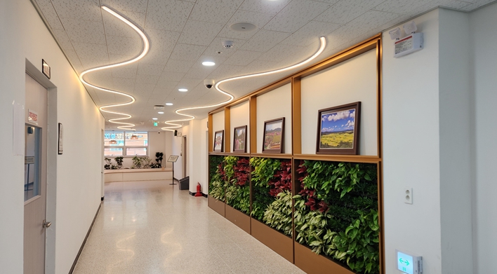 [뉴스다컴] 철원군은 7월에 조성한 와수복합어울림센터 4층 작은영화관 실내정원의 큰 호응에 힘입어, 2층 프로그램실 간 복도에 유휴공간을 활용하여 추가로 수직 정원 조성을 완료했다고 28일 밝혔다.