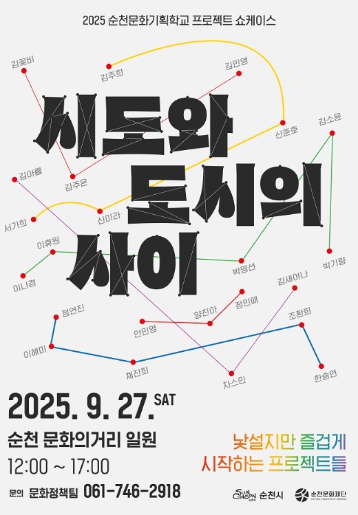 [뉴스다컴] (재)순천문화재단은 오는 27일 오후 12시부터 5시까지 문화의 거리 일원에서 2025 순천문화기획학교 프로젝트 쇼케이스 '시도와 도시의 사이'를 개최한다.