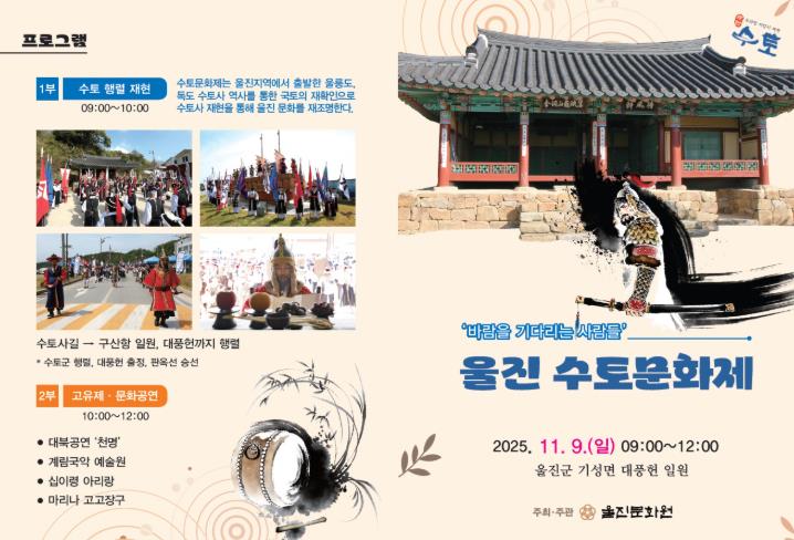 이번 문화제는 조선시대 수토사들의 출정과 임무 수행 과정을 생생히 재현함으로써, 울진이 영토 수호의 역사적 출발점임을 널리 알리고 군민의 자긍심을 높이는 데 목적을 두고 있다.
