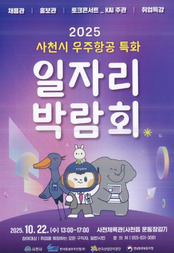 [뉴스다컴] 사천시는 오는 10월 22일 사천체육관에서 항공산업 중심의 청년 고용기회 확대를 위해 ‘2025년 사천시 우주항공특화 일자리박람회’를 개최한다.