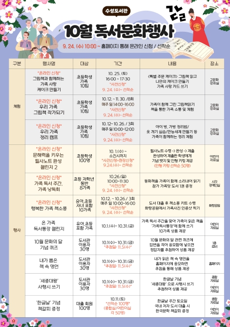 또, 10월 문화의 달을 기념하여 ▲문해력 필사노트 완성 챌린지,▲문화의 달 기념 퀴즈, ▲내가 뽑은 책 속 한 구절, ▲세종대왕 사행시 쓰기 등 다양한 추첨 경품 행사도 함께 진행된다.