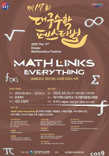 [뉴스다컴] 대구시교육청이 주최하고 대구중등수학교육연구회가 운영하는 ‘제17회 대구수학페스티벌’이 10월 25일 9시 30분부터 대구과학고 및 대구창의융합교육원에서 'Math Links Everything(수학은 모든 것을 연결한다)'이라는 주제로 개최된다.