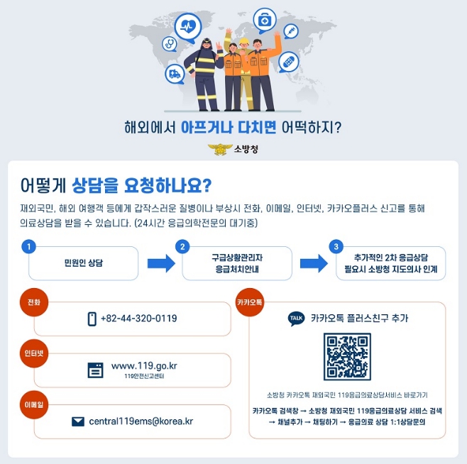 [뉴스다컴] 홍성소방서는 해외에서 예기치 못한 질병이나 부상 발생 시 신속한 대응을 돕기 위해 ‘재외국민 119응급의료 상담서비스’ 이용을 홍보한다고 밝혔다.