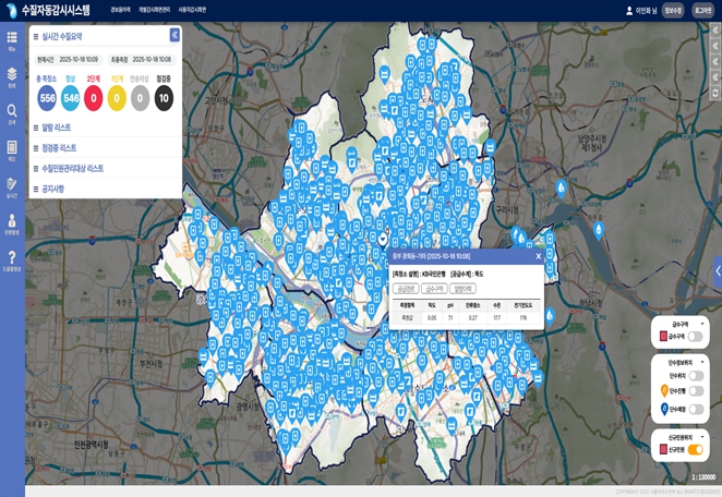 2019년 문래동 수질사고 이후 208개 지점에서 서울시내 모든 행정동을 포함한 556개 지점으로 대폭 확대하여 면밀한 수질감시체계를 구축‧운영하고 있다.