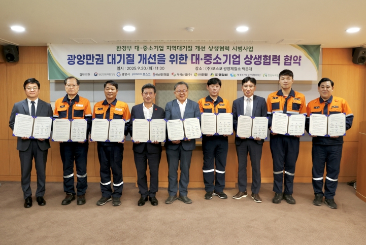 [뉴스다컴] 광양시와 영산강유역환경청은 9월 30일 국내 최대 철강업체인 ㈜포스코 광양제철소와 협력업체 4개사가 광양만권 지역 대기질 개선을 위해 ‘광양만권 대․중․소기업 지역 대기질 개선 상생협력 협약’을 체결했다고 밝혔다.