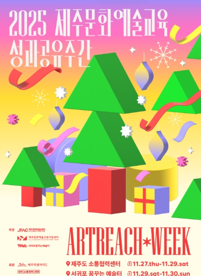 [뉴스다컴] 제주문화예술재단은 오는 27일부터 30일까지 4일간 제주도 소통협력센터(제주시 관덕로 44)와 서귀포 꿈꾸는 예술터(서귀포시 천제연로 164)에서 2025년 제주문화예술교육 성과를 도민에게 공유하는 문화예술교육 축제인 '아트리치위크'를 운영한다.