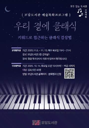 [뉴스다컴] 김포시 모담도서관은 클래식을 주제로 11월 6일부터 13일까지 매주 목요일 오후 7시부터 9시까지 특별 강연을 운영한다.
