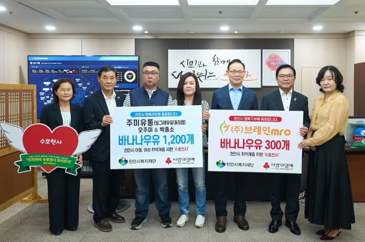 [뉴스다컴] 천안시는 주미유통(대표 오주미·박종소)과 브레인MRO(대표 김효열)가 우유 1,500개(270만 원 상당)를 천안시복지재단에 전달했다고 17일 밝혔다.