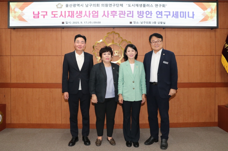 이정훈 대표의원은 “이번 연구세미나를 통해 우수 사례와 의견을 공유하며 남구 도시재생사업 사후관리 정책 방향성을 더욱 명확히 다질 수 있었다”며 “앞으로도 심도있는 연구 활동을 이어 나가며 도시가 더욱 활성화되고 주민들에게 실질적으로 도움이 되는 정책 방안을 마련하도록 노력하겠다”고 말했다.