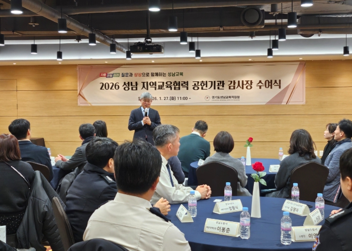 [뉴스다컴] 경기도성남교육지원청은 1월 27일 스카이파크 호텔에서 '성남 지역교육협력 공헌기관 감사장 수여식'을 개최하여 성남교육 발전을 위해 협력해 온 지역교육협력기관 22곳에 감사의 뜻을 전했다.
