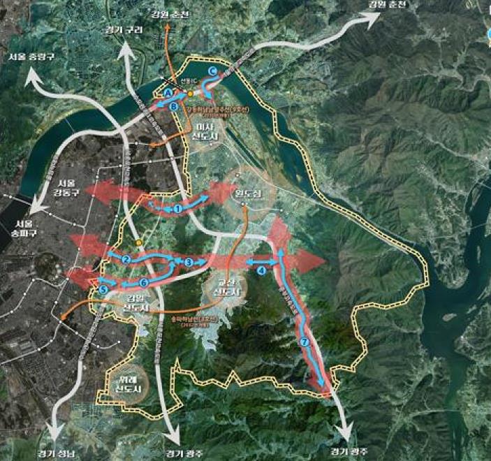 [뉴스다컴] 하남시가 5개의 광역철도망 계획에 이어 7개의 광역도로망 확충을 본격적으로 추진하며 명실상부한 ‘서울 30분 도시’, 수도권 동부 교통 허브로의 도약을 눈앞에 두고 있다. 교산신도시 광역교통개선대책의 일환으로 한국토지주택공사(LH), 경기주택도시공사(GH)가 총 3,267억 원(광역교통개선대책 기준)을 투입하여 시행하는 7개 광역도로망 사업은 광역교통개선대책 수립 당시 하남시의 적극적인 협의를 통해 반영된 대규모 프로젝트다. 하남시는 과거 신도시 조성 과정에서 겪었던 ‘선(先) 입주, 후(後) 교통’의 불편을 반복하지 않기 위해 계획 수립 단계부터 적극적으로 참여했으며, 현재 신도시 추진단(T/F)을 통해 철도와 도로망 계획을 통합 관리하며 LH, GH 등 관계기관과 함께 속도감 있게 사업을 추진하고 있다.