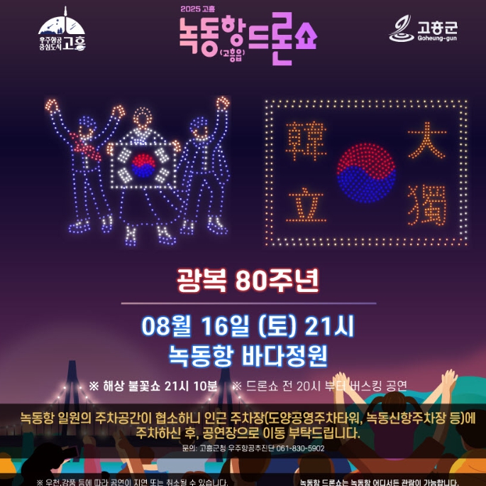 [뉴스다컴] 고흥군은 오는 8월 16일 저녁 9시, 녹동항 바다정원 일원에서 광복 80주년을 기념하는 ‘드론쇼 및 해상 불꽃쇼’를 성대히 개최한다고 밝혔다.