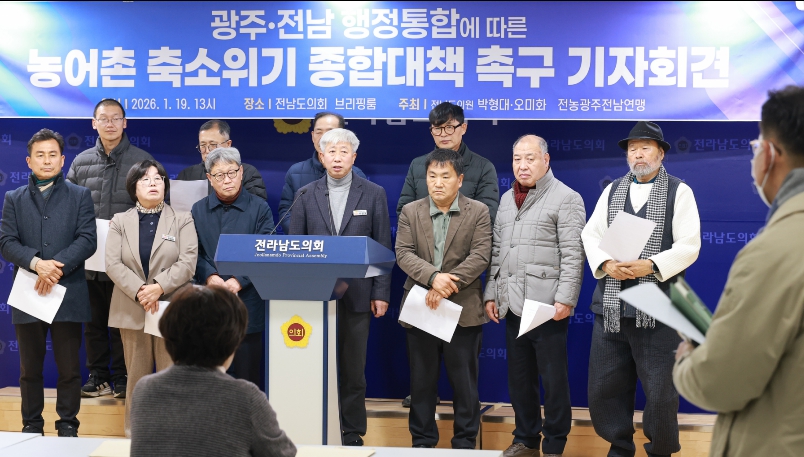 [뉴스다컴] 전라남도의회 박형대 의원(진보당·장흥1)은 1월 19일 도의회 브리핑룸에서 기자회견을 열고 “광주ㆍ전남 행정통합 논의가 속도를 내고 있지만 농어촌 축소 위기에 대한 대비는 현저히 부족하다”며 농어촌 보호를 위한 구체적 합의를 요구했다.