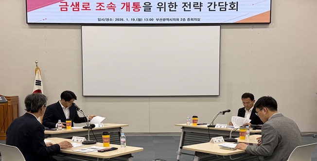 [뉴스다컴] 부산광역시의회 이준호.이종진 의원은 1월 19일 오후 1시, 시의회 중회의실에서 '금샘로 조속 개통을 위한 전략 간담회'를 개최했다. 이번 간담회는 산성터널 접속도로 미개설 구간인 금샘로 공사의 지연 원인을 점검하고, 조속한 사업 추진을 위한 실질적인 해결 방안을 모색하기 위해 마련됐다.