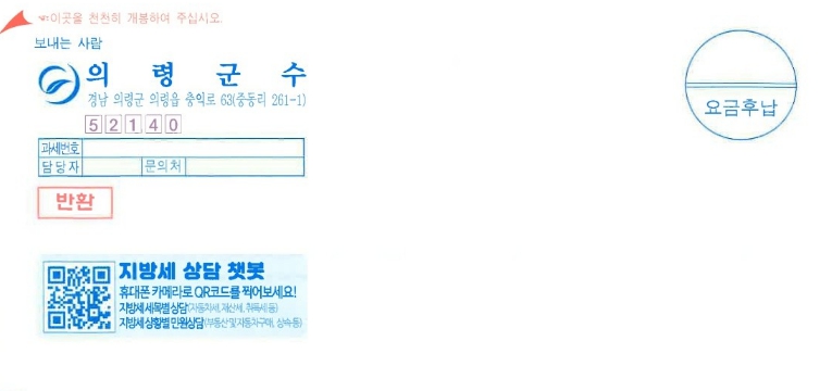 [뉴스다컴] 의령군은 지방세 고지서 전면에 ‘지방세 챗봇 상담서비스’ QR코드를 삽입해 발송한다고 밝혔다.