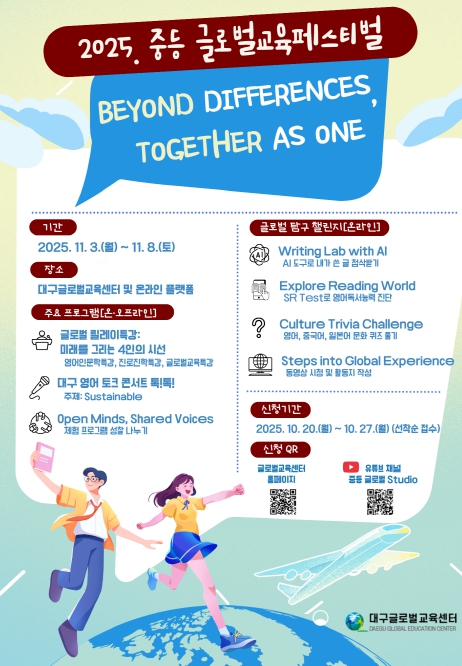 [뉴스다컴] 대구교육연수원 산하 대구글로벌교육센터는 11월 3일부터 8일까지 ‘Beyond Differences, Together as One(차이를 넘어, 하나로)’을 주제로 '2025 중등 글로벌교육페스티벌'을 개최한다.