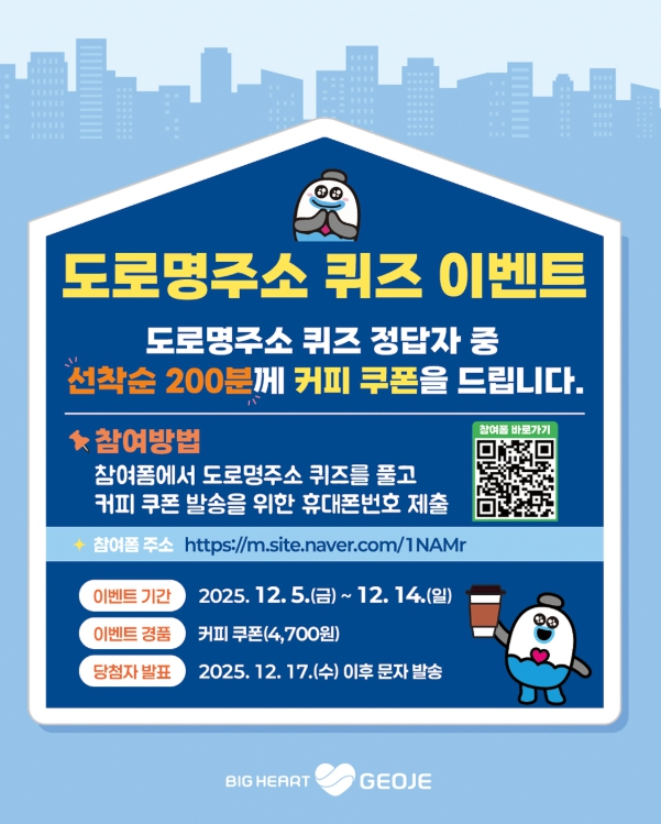 [뉴스다컴] 거제시는 12월 5일부터 도로명주소 온라인 퀴즈 이벤트를 진행한다고 밝혔다.