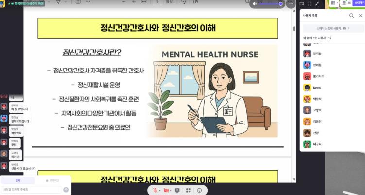 메타버스 플랫폼 ‘ZEP’을 활용한 비대면 과정은 총 14회 운영되며, 우울·불안 관리, 수면·식습관 개선, 스트레스 조절, 가족 소통기술 등 정신건강 증진 중심 교육을 체계적으로 제공했다.