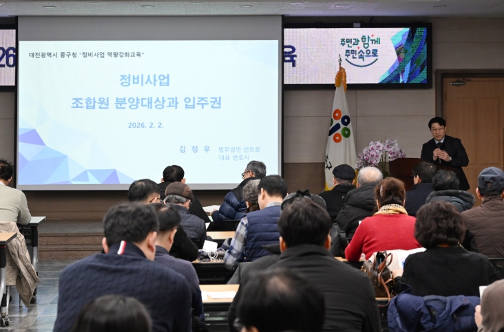 [뉴스다컴] 대전 중구는 2일 중구청 대회의실에서 재개발‧재건축 정비사업 관계 공무원 및 조합 임원 등 60여 명을 대상으로 ‘정비사업 역량강화 교육’을 실시했다고 밝혔다.