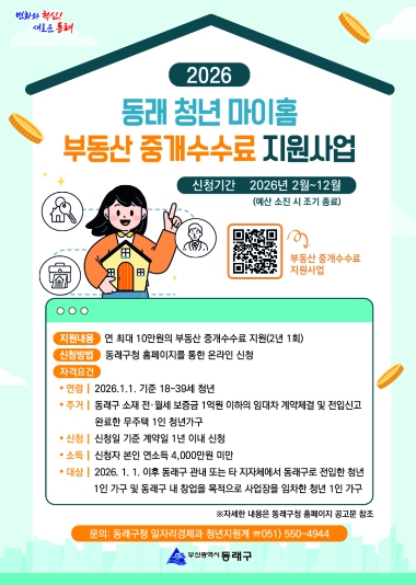 [뉴스다컴] 부산 동래구는 청년의 주거 안정을 지원하고 청년 창업을 유도하기 위해 ‘2026년 동래 청년 마이홈 부동산 중개수수료 지원 사업’을 추진한다고 밝혔다. 접수 기간은 12월 10일까지이며, 예산 소진 시 조기 마감된다.