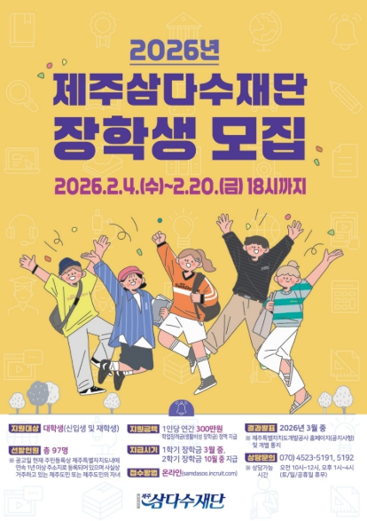 [뉴스다컴] 재단법인 제주삼다수재단(이사장 백경훈)이 제주와 대한민국의 미래를 이끌어갈 우수 인재 양성을 위해 2026년도 제주삼다수 장학생을 모집한다.