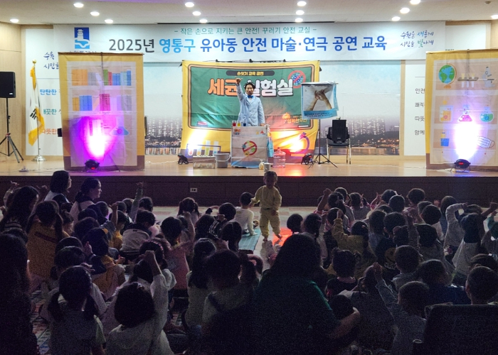 [뉴스다컴] 수원시 영통구는 2025. 10. 13. 영통구청 대회의실에서 관내 유아를 대상으로 안전한 위생 습관을 형성하기 위한 ‘찰리박사의 세균실험실’ 체험형 안전마술·연극 공연 교육을 실시했다.