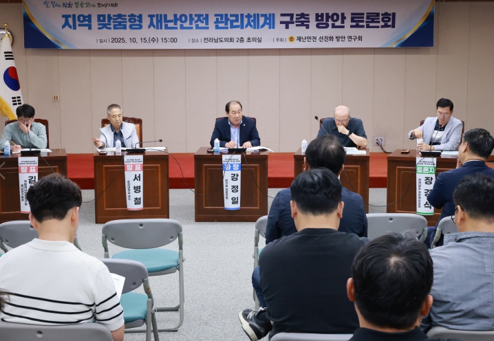 [뉴스다컴] 전라남도의회 의원 연구단체인'재난안전 선진화 방안 연구회'는 지난 10월 15일 전라남도의회 초의실에서 강정일 대표의원(광양2) 주재로 ‘지역 맞춤형 재난안전 관리체계 구축 방안’에 대한 토론회를 개최했다.
