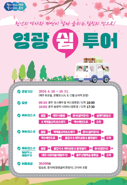 [뉴스다컴] 영광군은 4월 18일부터 10월 31일까지(7∼8월 폭염으로 제외) 토요 감성 힐링 여행‘2026년 영광 쉼 투어’를 매주 토요일 운영 한다고 밝혔다.