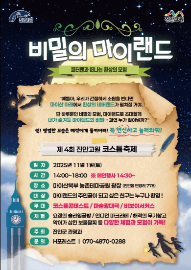 진안군 관계자는 “비밀의 마이랜드 축제는 마이산을 배경으로 펼쳐지는 특별한 코스튬 행사로, 전주·대전 등 인근 시군에서도 해마다 더 많은 분들이 찾아오고 있다”며 “주민과 관광객이 함께 어울려 즐기는 진안만의 신선하고 유쾌한 관광 축제인 만큼, 비밀의 마이랜드에서 특별한 가을날의 추억을 만들어 가시길 바란다”고 전했다.