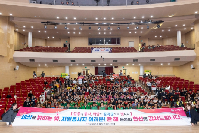 [뉴스다컴] 칠곡군은 지난 3일 칠곡군 왜관읍에 위치한 칠곡군 교육문화회관에서 ‘감동의 봉사, 희망의 칠곡군으로 빛나다’라는 주제로 김재욱 칠곡군수, 이상승 칠곡군의회 의장을 비롯한 주요 기관단체장과 자원봉사자 700여명이 참석한 가운데‘2025년 칠곡군 자원봉사자 대회’를 개최했다.