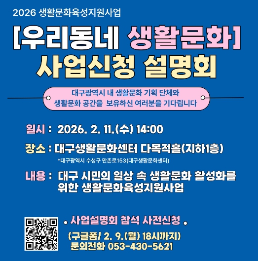 접수는 2월 6일부터 2월 20일 17시까지 대구생활문화센터 누리집을 통해 온라인으로 진행된다.