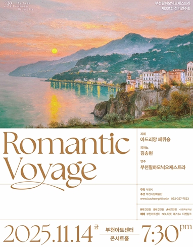 [뉴스다컴] 부천필하모닉오케스트라가 오는 11월 14일 오후 7시 30분 부천아트센터 콘서트홀에서 제331회 정기연주회 'Romantic Voyage'를 개최한다. 공연에는 상임지휘자 아드리앙 페뤼숑과 부천필이 무대에 오르며, 협연자로는 탁월한 음악적 이해력과 구성력으로 호평받는 피아니스트 김송현이 ‘낭만적 여정’에 함께 오른다.