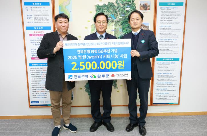[뉴스다컴] 전북은행이 연말을 맞이해 완주군청에 취약계층을 위한 ‘2025 방한(Warm) 키트’ 60상자(250만 원 상당)를 전달했다고 18일 밝혔다.