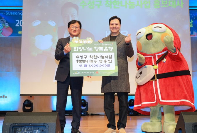[뉴스다컴] 대구 수성구 ‘착한나눔사업’ 홍보대사인 배우 정웅인 씨는 지난 16일 열린 2025년 수성구 지역사회보장협의체 ‘성과 공유 및 기부자 감사의 날’ 행사에 참석해 관내 어려운 이웃을 위해 사용해 달라며 성금 100만 원을 수성구청에 전달했다.