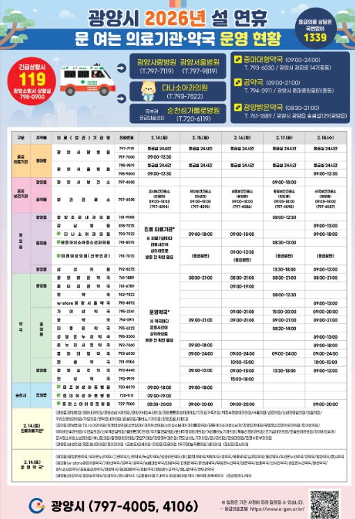 이와 함께 상·하수도 및 안전 관련 민원도 전문업체와 협력해 원활히 처리하며, 병·의원 및 약국 운영 일정과 생활민원 관련 정보는 광양시 누리집을 통해 안내할 방침이다.