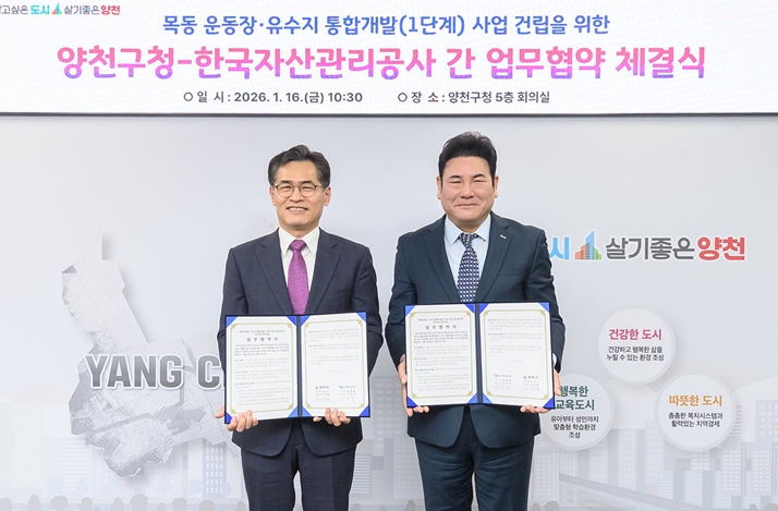 [뉴스다컴] 양천구가 1월 16일 한국자산관리공사와 업무협약을 체결하며, 목동운동장·유수지 일대 통합개발(목동MICE)을 위한 첫걸음을 내디뎠다.