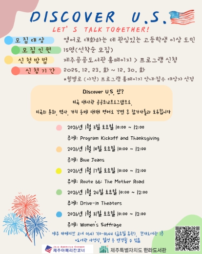 [뉴스다컴] 제주특별자치도 한라도서관은 주한미국대사관과 협력해 도민의 글로벌 이해와 영어 활용 역량 강화를 위한 교육 프로그램 ‘Discover U.S.’를 올해부터 운영한다고 밝혔다.