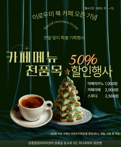 12월 말까지 이로우미 북 카페의 모든 메뉴를 50% 할인된 가격에 만나볼 수 있다.