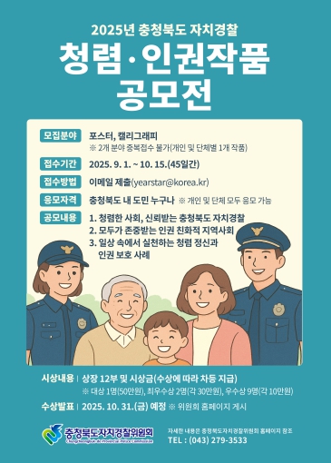 [뉴스다컴] 충청북도자치경찰위원회는 도민을 대상으로 ‘2025년 청렴‧인권작품 공모전’을 개최한다고 밝혔다. 이번 공모전은 생활 속 청렴 정신과 인권 존중의 가치를 널리 확산하고, 도민과 함께 소통하는 참여의 장을 마련하기 위해 추진된다.