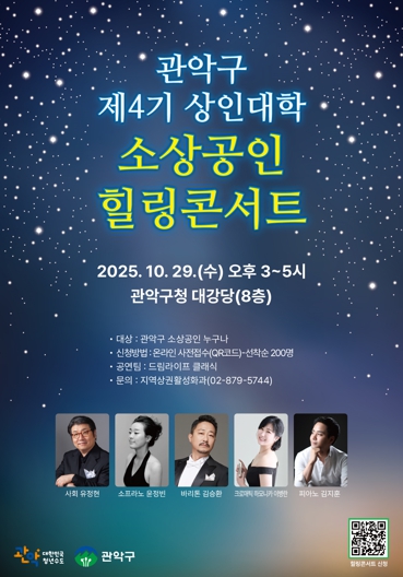 [뉴스다컴] 관악구는 오는 10월 29일 오후 3시, 구청 8층 대강당에서 관내 소상공인을 위한 힐링콘서트를 개최한다.