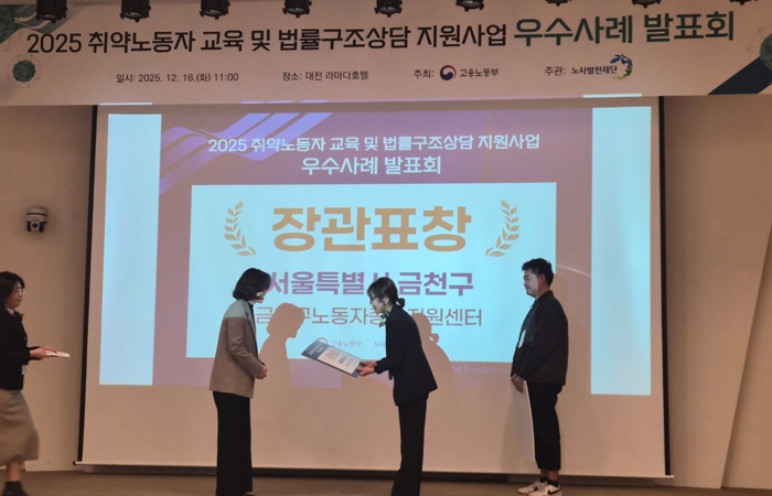 앞서 고용노동부는 부당해고, 보복성 징계, 근무지 강제 변경 등 취약노동자의 권리 침해 사례 해결 과정과 구제 성과를 기준으로 ‘2025년 노동약자 교육 및 법률구조상담 지원사업’에 대한 평가를 진행했다. 그 결과 전국 지자체 중 금천구와 음성군이 법률구조상담 대표 우수사례로 선정됐다.