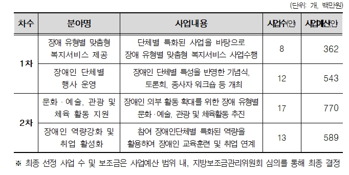 지원사업 1차 공모는 오는 23일(금) 18시까지로 ▴장애 유형별 맞춤형 복지서비스 제공 ▴장애인 단체별 행사 운영 분야를 대상으로 진행되며 결과는 2월 중 발표할 예정이다. 2차 공모 접수는 2월 10일부터 2월 20일 18시까지이며 ▴문화·예술·관광·체육활동 ▴장애인 역량 강화 및 취업 활성화 분야이다.