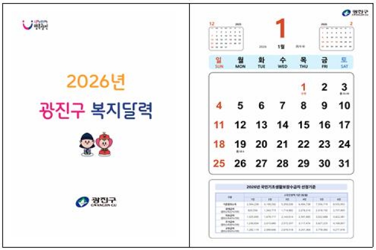 달력에 수록된 주요 내용은 ▲2026년도 국민기초생활보장수급자 선정 기준 ▲생계·의료·주거·교육급여 지원 내용 ▲서울형 기초보장제도 ▲해산·장제급여 지원 사항 등이다. 아울러 ▲생계·의료 수급 가구 이사비용 지원 ▲저소득 주민 교육경비·교통비·문화체육활동비 지원 ▲광진구 기초복지 알림톡 활용 안내에 대해서도 확인할 수 있다.