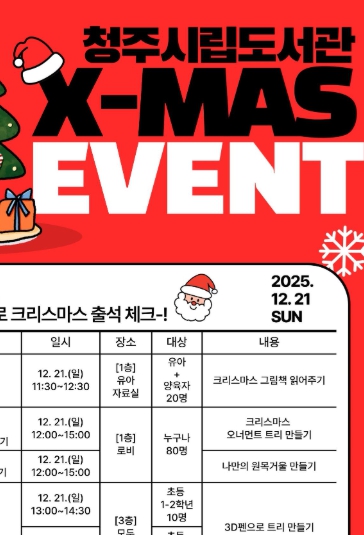 [뉴스다컴] 청주시립도서관은 크리스마스를 맞아 시민들이 연말을 더욱 특별하게 보낼 수 있도록 연말까지 도서관에서 다양한 체험 행사와 공연, 전시를 운영한다고 밝혔다.
