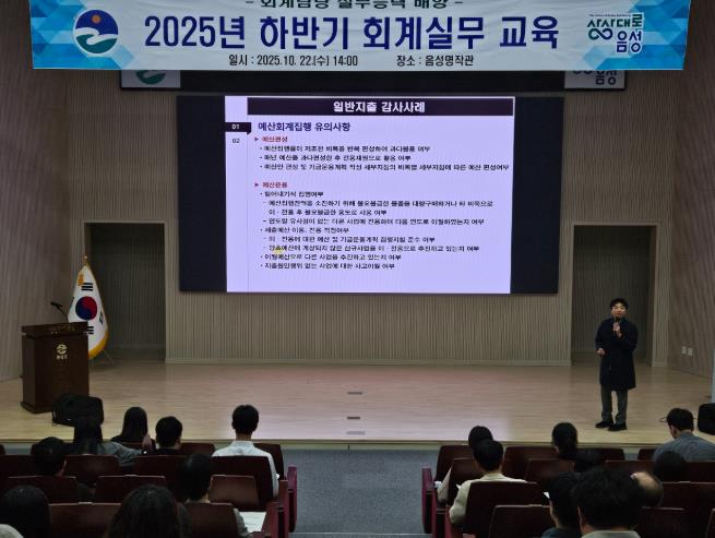[뉴스다컴] 음성군은 22일 음성명작관에서 회계 담당 군 공직자 130여 명을 대상으로 ‘2025년 하반기 회계실무 교육’을 실시했다.
