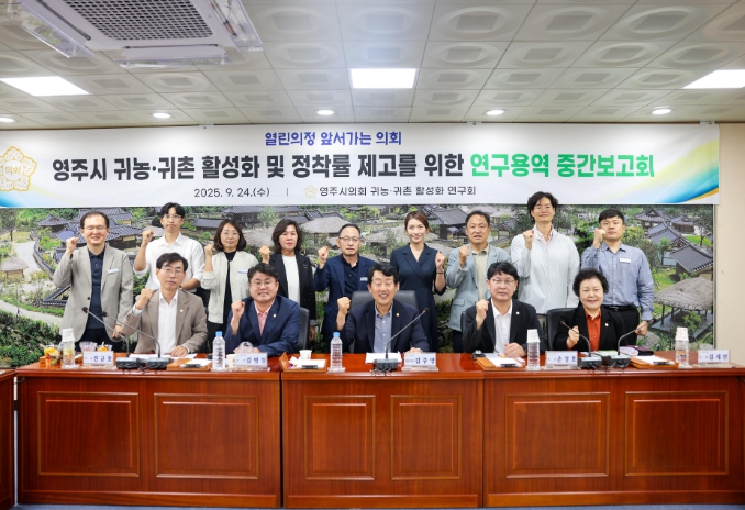 [뉴스다컴] 영주시의회 의원연구단체인‘귀농·귀촌 활성화 및 정착률 제고를 위한 방안 연구회’(대표의원 김주영)는 9월 24일 영주시의회 소회의실에서 연구용역 중간보고회를 열고, 귀농·귀촌인의 안정적 정착을 위한 정책 대안을 모색했다.