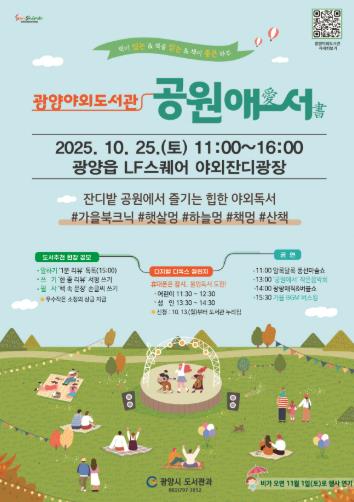 [뉴스다컴] 광양시는 오는 10월 25일 광양읍 LF스퀘어 잔디밭공원에서 자연과 책이 어우러진 『광양 야외도서관–공원애愛서書』 행사를 연다고 밝혔다.