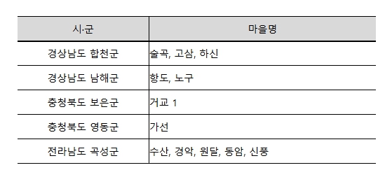 조사 이후 상수원 보호구역, 하수도보급률 등을 고려하여 최종 5개 지자체 12개 마을을 선정했다.
